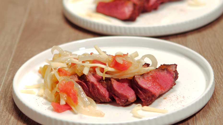 Espolvorea cada trozo de carne con el pimentón. A continuación, agregue la mezcla de cebolla sobre cada trozo. Añade por encima el queso.
